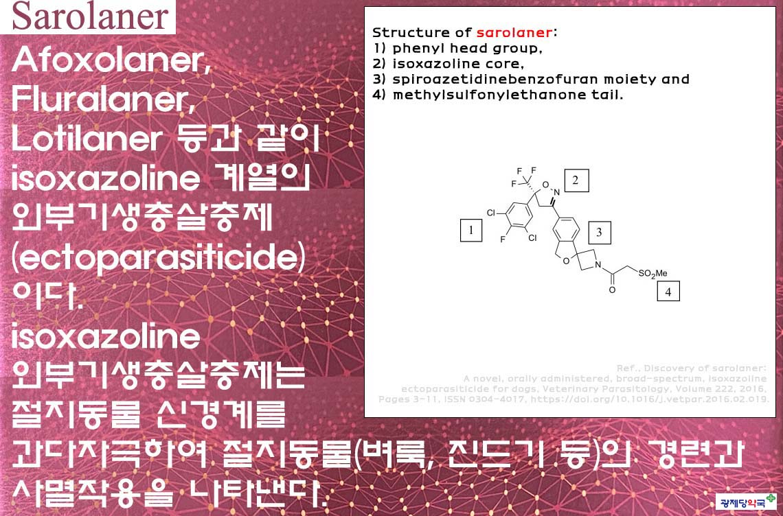 Sarolaner는 1개월에 1회 투여하는 벼룩과 진드기 예방 지속형 경구제제로 디자인되었다. 이러한 경구제제는 털 위 국소제제 적용 시 문제점인 핥기, 씻김, 인체 및 타 동물 노출 위험성을 크게 줄일 수 있는 장점이 있다.
